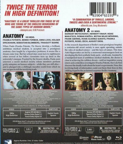 In the research department of Berlin's most prestigious hospital, a centuries-old secret society is once again operating outside the rules of medical science - and the laws of nature. This time Anti-Hippocratics are led by a renowned neurosurgeon bent on developing the first synthetic body parts - at all costs. Assisted by a handpicked team of ambitious medical students, the doctor is close to achieving his ruthless dream - until an inquisitive young intern and a relentless investigator discover the deadly truth about the team's experiments. Now, this terrifying body of information could cost them their lives in this chilling sequel to the acclaimed suspense thriller Anatomy.