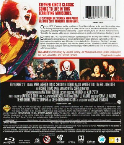 October 1957: "It" awakens and the small town of Darry, Maine will never be the same. Stephen King brings to life every childhood fear and phobia as seven children face an unthinkable horror which appears in various forms, including "Pennywise" (Tim Curry) - a clown who lives, hunts and kills from the town's sewers. Years later, the surviving adults who are brave enough return to stop the new killing spree, this time for good.