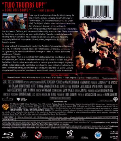 A new love. A new hometown. Peter Appleton is having the time of his life...by living someone else's life. Directed by Frank Darabont, The Majestic is both a valentine to the movies and the story of one man's discovery of his own integrity. Jim Carrey plays Peter, a Hollywood screenwriter who stumbles into tiny Lawson, California, with his memory blanked out by an auto accident. There, he's mistaken by the citizenry for a long-lost war hero...an identity that Peter also comes to believe while restoring the town's shuttered movie palace and romancing the girl he supposedly left behind. It's the perfect life and, perhaps, the perfect lie. But the truth is bound to surface.