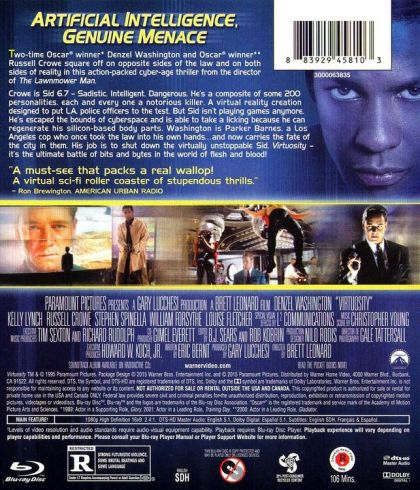 Crowe is Sid 6.7 - Sadistic, Intelligent, Dangerous. He's a composite of some 200 personalities, each and every one a notorious killer. A virtual reality creation designed to put L.A. police officers to the test. But Sid isn't playing games anymore. He's escaped the bounds of cyberspace and is able to take a licking because he can regenerate his silicon-based body parts. Washington is Parker Barnes, a Los Angeles cop who once took the law into his own hands... and now carries the fate of the city in them. His job is to shut down the virtually unstoppable Sid. Virtuosity - it's the ultimate battle of bits and bytes, in the world of flesh and blood!