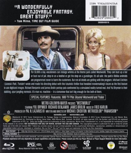 Pour 1000 dollars par jour, les vacanciers peuvent réaliser leurs rêves les plus fous dans un parc thématique baptisé Westworld. Ils peuvent provoquer une bagarre dans un bar ou s'évader de prison, faire une virée dans un bordel ou descendre un bandit armé. La sécurité des clients est assurée parce que les humanoïdes qui peuplent le parc sont programmés pour ne jamais les blesser. Mais certains robots se mettent à dévier du programme... Michael Crichton (Le Parc Jurassique. Tornade) signe le scénario et la réalisation (sa première) de ce suspense futuriste qui a ouvert la voie au cinéma de demain en étant le premier long métrage à employer des images numériques. Richard Benjamin et James Brolin interprètent deux copains qui se retrouvent confrontés à une réalité simulée devenue bel et bien réelle. Et Yul Brynner incarne leur âme damnée, un prédateur aux éperons cliquetants. C'est le combat entre l'homme et la machine — dans un avenir qui n'est pas assez grand pour les deux.