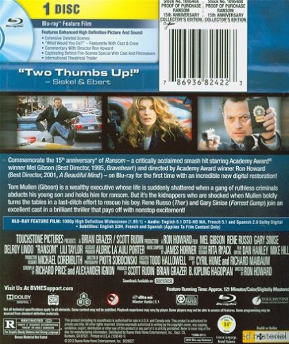 Commemorate the 15th anniversary of Ransom — a critically acclaimed smash hit starring Academy Award® winner Mel Gibson (Best Director, 1995, Braveheart) and directed by Academy Award winner Ron Howard (Best Director, 2001, A Beautiful Mind) — on Blu-ray for the first time with an incredible new digital restoration!
