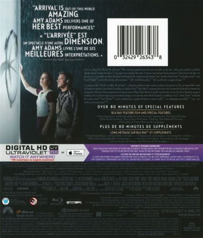 La critique considère L'Arrivée « le meilleur film de l’année ». Lorsque de mystérieux vaisseaux spatiaux se posent un peu partout sur Terre, une équipe d'élite, menée par l'experte en traduction Louise Banks (la candidate aux Academy Award Award(md) Amy Adams), entreprend une course contre la montre afin de décoder les intentions des extraterrestres. Alors que la tension augmente entre les gouvernements effrayés. Banks découvre la véritable raison de cette venue et, dans le but d'empécher une guerre mondiale, prend une décision risquée qui pourrait mettre en danger sa vie et peut-être même celle de l'humanité. Le candidat aux Oscar(md) Jeremy Renner et le lauréat des Academy Award(md) Forest Whitaker sont les covedettes de ce « superbe chef-d’œvre à couper le soufflé » au « dénouement époustouflant » que « vous voudrez voir encore et encore ».