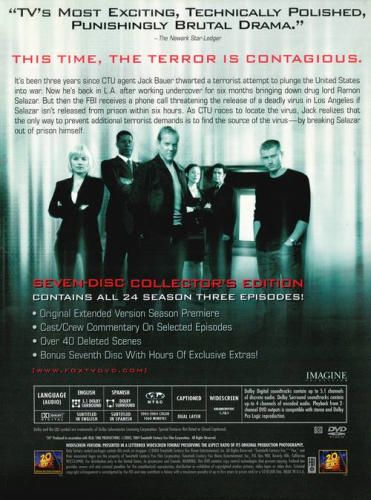 It's been three years since CTU agent Jack Bauer thwarted a terrorist attempt to plunge the United States into war. Now he's back in L.A. after working undercover for six months bringing down drug lord Ramon Salazar. But then the FBI receives a phone call threatening the release of a deadly virus in Los Angles if Salazar isn't released from prison within six hours. As CTU races to locate the virus, Jack realizes that the only way to prevent additional terrorist demands is to find the source of the virus - by breaking Salazar out of prison himself.Episode List:1. 1:00 PM - 2:00 PM2. 2:00 PM - 3:00 PM 3. 3:00 PM - 4:00 PM 4. 4:00 PM - 5:00 PM5. 5:00 PM - 6:00 PM6. 6:00 PM - 7:00 PM7. 7:00 PM - 8:00 PM8. 8:00 PM - 9:00 PM9. 9:00 PM - 10:00 PM10. 10:00 PM - 11:00 PM11. 11:00 PM - 12:00 AM12. 12:00 AM - 1:00 AM 13. 1:00 AM - 2:00 AM14. 2:00 AM - 3:00 AM15. 3:00 AM - 4:00 AM16. 4:00 AM - 5:00 AM17. 5:00 AM - 6:00 AM 18. 6:00 AM - 7:00 AM19. 7:00 AM - 8:00 AM 20. 8:00 AM -9:00 AM21. 9:00 AM - 10:00 AM22. 10:00 AM - 11:00 AM 23. 11:00 AM - 12:00 PM24. 12:00 PM - 1:00 PM