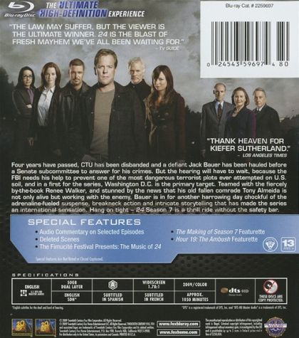 Four years have passed, CTU has been disbanded and a defiant Jack Bauer has been hauled before a Senate subcommittee to answer for his crimes. But the hearing will have to wait, because the FBI needs his help to prevent one of the most dangerous terrorist plots ever attempted on U.S. soil, and in a first for the series, Washington D.C. is the primary target. Teamed with the fiercely by-the-book Renee Walker, and stunned by the news that his old fallen comrade Tony Almeida is not only alive but working with the enemy. Bauer is in for another harrowing day chockfull of the adrenaline-fueled suspense, breakneck action and intricate storytelling that has made the series an international sensation. Hang on tight - 24 Season 7 is a thrill ride without the safety bar.
