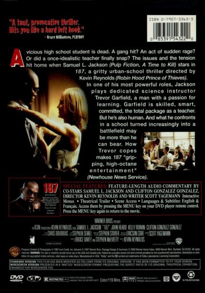 A vicious hgh school student is dead. A gang hit? An act of sudden rage? Or did a once-idealistic teacher finally snap? the issues and the tension hit home when Samuel L. Jackson (Pulp Fiction, A Time to Kill) stars in 187, a gritty urban-school thriller directed by Kevin Reynolds (Robin Hood Prince of Thieves).In one of his most powerful roles, Jackson plays dedicated science instructor Trevor Garfield, a man with a passion for learning. Garfield is skilled, smart, committed, the total package as a teacher. But he's also human. And what he confronts in a school turned increasingly into a battlefield may be fore than the can bear. How Trevor copes makes 187 "gripping, high-octane entertainment" (Newhouse News Service).
