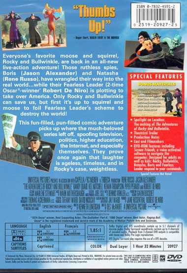 Everyone's favorite moose and squirrel, Rocky and Bullwinkle, are back in an all-new live-action adventure! Those ruthless spies, Boris ('Jason Alexander') and Natasha ('Rene Russo'), have wrangled their way into the real world...while their Fearless Leader (2-time Oscar®-winner* 'Robert De Niro') is plotting to take over America. Only Rocky and Bullwinkle can save us, but first it's up to squirrel and moose to foil Fearless Leader's scheme to destroy the world!This fun-filled, pun-filled comic adventure picks up where the much-beloved series left off, spoofing television, politics, higher education, the Internet, and especially themselves. They prove once again that laughter is ageless, timeless, and in Rocky's case, weightless.*1974 Oscar® winner, Best Supporting Actor, 'The Godfather: Part II'; 1980 Oscar® winner, Best Actor, 'Raging Bull'.