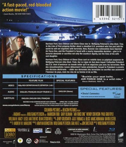 Harrison Ford, Gary Oldman and Glenn Close star in Wolfgang Peterson's (Das Boot, Troy, In the Line of Fire) gripping thriller about a steadfast U.S. president who has just told the world he will not negotiate with terrorists. Now, Russian neo-nationalists have hijacked Air Force One, and the President is faced with a nearly impossible decision - give in to terrorist demands or sacrifice not only the country's dignity, but the lives of his wife and daughter.Harrison Ford, Gary Oldman et Glenn Close sont en vedette dans ce palpitant suspence de Wolfgang Peterson (Das Boot, Troie, Sur la Ligne de Feu) dans lequel l'inflexible Président des États-Unis vient d'annoncer au monde entier qu'il ne négociera pas avec les terroristes. Mais des néonationalistes russes détournent l'avion présidentiel, forçant le Président à prendre une décision déchirante - céder aux demandes des terroristes ou sacrifier non seulement l'honneur du pays, mais les vies de sa femme et de sa fille.