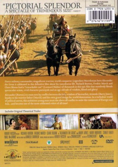 Power Was His DestinyFierce military commander, magnificent warrior, world conqueror. Legendary Macedonian hero Alexander the Great is celebrated in this definitive film about his tumultuous life. Richard Burton, Fredric March and Claire Bloom lead a "remarkable cast" (Leonard Maltin) of thousands in this epic film that seamlessly blends spectacular action, vivid character portrayals and an age-old tale of wisdom, blood and glory! Alexander (Burton) is a man torn by conflict between the lofty wisdom of his teacher, Aristotle (Barry Jones), loyalty to his warrior father (March) and his own grand design for world domination. In a turbulent world of political unrest, this ambitious young man must rise above all conflict to unite the continents of Europe and Asia...and become one of the most celebrated rulers of all time!