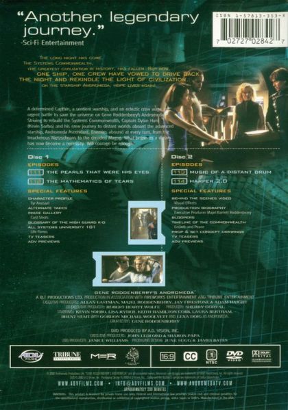 The long night has come. The Systems Commonwealth, the greatest civilization in history, has fallen. But now.... one ship, one crew have vowed to drive back the night and rekindle the light of civilization. On the Starship Andromeda, hope lives again!A determined Captain, a sentient warship, and an eclectic crew wage an urgent battle to save the universe on Gene Roddenberry's Andromeda. Striving to rebuild the Systems Commonwealth, Captain Dylan Hunt (Kevin Sorbo) and his crew journey to distant worlds aboard the advanced starship, Andromeda Ascendant. Enemies abound at every turn, from the treacherous Nietzscheans to the dreaded Magog. What began as a dream has now become a necessity. Will courage be enough?Disc One Episodes:111 The Pearls that Were His Eyes 112 The Mathematics of TearsDisc Two Episodes:113 Music of a Distant Drum114 Harper 2.0