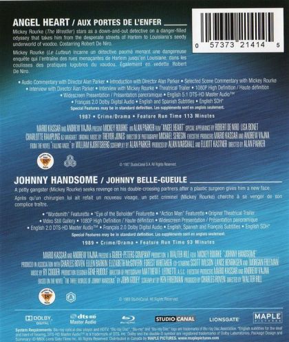 Angel Heart:Mickey Rourke (The Wrestler) Stars as a down-and-out detective on a danger-filled odyssey that takes him from the desperate streets of harlem to Louisiana's seedy underworld of voodoo. Costarring Robert De Niro.Johnny Handsome:A petty gangster (Mickey rourke) seeks revenge on his double-crossing partners after a plastic surgeon gives him a new face.