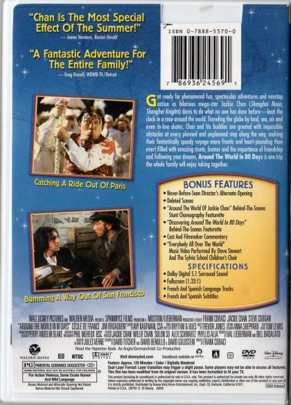 Get ready for phenomenal fun, spectacular adventures and nonstop action as hilarious mega-star Jackie Chan (Shanghai Noon, Shanghai Knights) dares to do what no one has done before - beat the clock in a race around the world. Traveling the globe by land, sea, air and even in-line skates, Chan and his buddies are greeted with impossible obstacles at every planned and unplanned stop along the way, making their fantastically speedy voyage more frantic and heart-pounding than ever! Filled with amazing stunts, humor and the importance of friendship and following your dreams, Around The World In 80 Days is one trip the whole family will enjoy taking together.