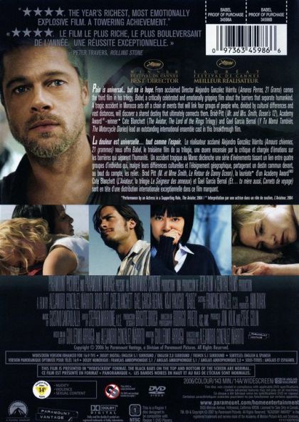 Pain is universal... but so is hope. From acclaimed Director Alejandro González Iñárritu (Amores Perros, 21 Grams) comes the third film in his trilogy, Babel, a critically celebrated and emotionally gripping film about the barriers that separate humankind.A tragic accident in Morocco sets off a chain of events that will link four groups of people who, divided by cultural differences and vast distances, will discover a shared destiny that ultimately connects them. Brad Pitt (Mr. And Mrs. Smith, Oceans 12), Academy Award® winner Cate Blanchett (The Aviator, The Lord Of The Rings Trilogy) and Gael García Bernal (Y Tu Mamá También, The Motorcycle Diaries) lead an outstanding international ensemble cast in this breakthrough film. ---------------------------------------La douleur est universelle… tout comme l’espoir. Le réalisateur acclamé Alejandro Gonzalez Inarritu (Amours Chiennes, 21 Grammes), nous offre Babel, le troisième film de sa trilogie, une œuvre encensée par la critique et chargée d’émotions sur les barrières qui séparent l’humanité. Un accident tragique au Maroc déclenche une série d’événements tissant un lien entre quatre groupes d’individus qui, malgré leurs différences culturelles et l’éloignement géographique, partageront un destin commun devant, au bout du compte, les relier. Brad Pitt (M. et Mme Smith, Le Retour de Danny Ocean), la lauréate d’un Academy Award Cate Blanchett (L’Aviateur, la trilogie Le Seigneur des Anneaux) et Gael Garcia Bernal (Et… Ta Mère Aussi, Carnets de Voyage) sont en tête d’une distribution internationale exceptionnelle dans ce film marquant.