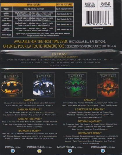 Batman (1989)Jack Nicholson is the Joker, who emerged from a horrible accident as a maniacal criminal. Michael Keaton is the Caped Crusader, who emerged from a childhood trauma to become a masked crime fighter. Kim Basinger is Vicki Vale, the talented photojournalist desired by both men. And Batman is the movie, the all-out spectacular directed by Tim Burton, set to songs by Prince and a music score by Danny Elfman, and an Academy Award® winner for Best Art Direction/Set Decoration (Anton Furst and Peter Young).Batman Returns (1992)Gotham City faces two monstrous criminal menaces: the bizarre, sinister Penguin (Danny DeVito) and the slinky, mysterious Catwoman (Michelle Pfeiffer). Can Batman (Michael Keaton) battle two formidable foes at once? Especially when one wants to be mayor and the other is romantically attracted to Bruce Wayne? Like the groundbreaking 1989 original, Batman Returns is directed by the wizardly Tim Burton. And like the first blockbuster, it's a dazzling adventure that leaves you breathless. Batman Forever (1995)Riddle me this, riddle me that, you'll find adventure on the wings of a bat! Brace for excitement as Batman (Val Kilmer), Two-Face (Tommy Lee Jones), the Riddler (Jim Carrey), Dr. Chase Meridian (Nicole Kidman) and Robin (Chris O'Donnell) star in the third formidable film in Warner Bros.' Batman series. Joel Schumacher directs and Tim Burton co-produces this thrill-ride of a movie that thunders along on Batmobile, Batwing, Batboat, Batsub and bold heroics. Hang on!Batman & Robin (1997)George Clooney plays the Dark Knight, facing his deadliest threat yet: cold-hearted Mr. Freeze (Arnold Schwarzenegger) and venomous Poison Ivy (Uma Thurman). Batman has more than Gotham City to protect: the youthful eagerness of crimefighting comrades Robin (Chris O'Donnell) and Batgirl (Alicia Silverstone) puts them frequently in harm's way. New very special effects include a wild sky-surfing sequence and Mr. Freeze's outrageous arsenal of ice-blasting weapons.