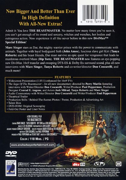 Admit it: You love THE BEASTMASTER. No matter how many times you've seen it, you can't get enough of its sword and sorcery, witches and wenches, hot bodies and outrageous action. Now experience it all like never before in this new DiviMax Special Edition!Marc Singer stars as Dar, the mighty warrior prince with the power to communicate with animals. Together with loyal bodyguard Seth (John Amos), luscious slave girl Kiri (tany Roberts) and his beast friends, Dar must survive an epic quest for vengeeance that leads to murderous overlord Maax (Rip Torn). THE BEASTMASTER now features an eye-popping new DiviMax 16X9 transfer and sweeping DTS-ES & Dolby EX Surround sound, plus all-new interviews with Marc Singer, Tany Roberts and co-writer/director Don Coscarelli, and much more!