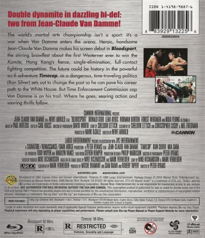 The world's martial arts championship isn't a sport: it's a war when Van Damme enters the arena. heroic, Handsome Jean-Claude Van Damme makes his screen debut in Bloodsport, the stirring brawlfest about the first Westerner ever to win the Kumite, Hong Kong's fierce, single elimination, full-contact fighting competition. The future could be history in the powerful sci-fi adventure Timecop, as a dangerous, time-traveling politico (Ron Silver) sets out to change the past so he can pave his career path to the White House. But Time Enforcement Commission cop Van Damme is on his trail. Where he goes, searing action and soaring thrills follow.