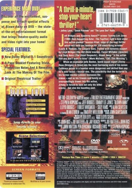 "A thrill-a-minute, stop-your-heart thriller!" -Jeffery Lyons, "Sneak Previews" and "The Lyons Den" Radio Jeff Bridges and Academy Award winner Tommy Lee Jones (1993: Best Supporting Actor, The Fugitive) light a fuse under this action-packed "tension-filled, edge-of-the-seat thriller which will hold you hostage for 120 electrifying minutes" (Louis B. Hobson, The Calgary Sun). Fueled with dynamic support by Lloyd Bridges (the Hot Shot movies), Forest Whitaker (Species) and Suzy Amis (The Usual Suspects), Blown Away "is the action film you don't want to miss" (Mark McEwen, "CBS This Morning"). When an explosion jolts Boston, bomb squad expert Jimmy Dove (Bridges) is thrust into the most harrowing work of his career. Evidence points to a bomber more dangerous and skille than any he's ever faced - except one. The possibility that the terroist is his former mentor (Jones) increases the stakes - and as his friends and family are unsuspectingly drawn inti the action, Jimmy is forced to face not only his bitter enemy...but also his haunting past.
