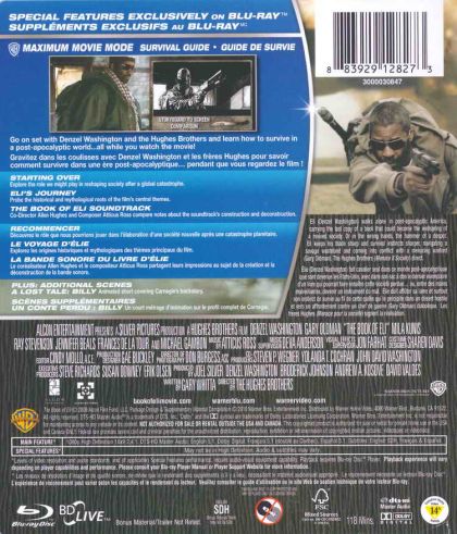 Eli walks alone in post-apocalyptic America, carrying the last copy of the book that could become the wellspring of a revived society. Or in the wrong hands, the hammer of a despot. Eli keeps his blade sharp and survival instincts sharper, navigating a savage wasteland and coming into conflict with a menacing warlord (Gary Oldman). The Hughes Brothers (Menace II Society) direct.Elie (Denzel Washington) fait cavalier seul dans ce monde post-apocalyptique que sont devenus les États-Unis, avec dans son sac à dos le dernier exemplaire d’un livre qui pourrait faire renaître cette société perdue… où, entre des mains malveillantes, devenir un instrument du mal. Elie doit affuter sa lame et surtout son instinct de survie au fil de cette quête qui le précipite dans un désert hostile et vers un affrontement contre un chef de guerre (Gary Oldman) diabolique. Les frères Hughes (Menace pour la Société) signent la réalisation.