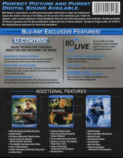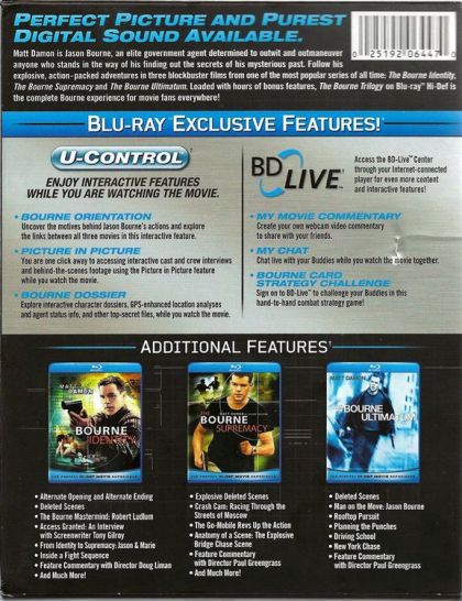 Matt Damon is Jason Bourne, an elite government agent determined to outwit and outmaneuver anyone who stands in the way of his finding out the secrets of his mysterious past. Follow his explosive, action-packed adventures in three blockbuster films from one of the most popular series of all time: The Bourne Identity, The Bourne Supremacy and the Bourne Ultimatum. Loaded with hours of bonus features, The Bourne Trilogy on Blu-ray Hi-Def is the complete Bourne experience for movie fans everywhere!