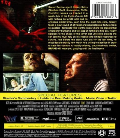 Secret service agent Jeremy Reins (Stephen Dorff, Somewhere, Public Enemies) wakes up trapped in a plastic box in the trunk of a car, left with nothing but a CB radio and an ominous digital timer. Each time the clock hits zero, Jeremy faces a new round of physical and psychological torture from his captors - terrorists who want to know where the presidential emergency bunker is and will stop at nothing to find out. Nearly helpless to the chaos of the terror plot unfolding outside the car, Jeremy must rely on his resolve and limited resources to survive. And before the clock runs out for the last time, he must decide exactly how much he's willing to sacrifice in order to save his country. A rapidly-twisting, claustrophobic thriller, Brake will leave you gasping until the final frame.