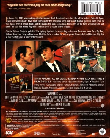 In Kansas City 1933, wisecracking Murphy (Burt Reynolds) tracks the killer of his partner. Police Lt. Speer(Clint Eastwood) doesn’t have much tolerance for the local mob wars body count. Neither guy likes each other, sothat makes them a dream team. And it provides the ideal scenario as they clean up the town with slug fests andshoot-’em-ups that parody Reynolds' and Eastwood's macho screen images.Director Richard Benjamin gets the ’30s stylishly right and the supporting cast · Jane Alexander, Irene Cara, Rip Torn,Richard Roundtree, Tony Lo Bianco and Madeline Kahn - makes the antics sparkle. Hard-boiled and hilarious, City Heatis your red-hot ticket to starry entertainment.