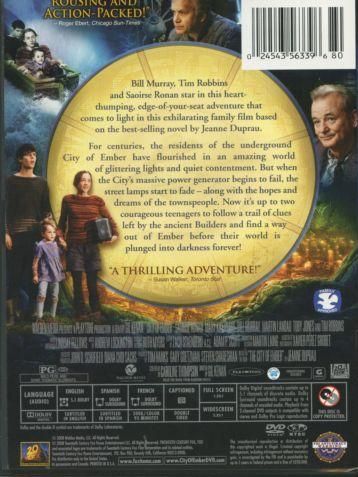 Bill Murray, Tim Robbins and Saoirse Ronan star in this heart-thumping, edge-of-your-seat adventure that comes to light in this exhilarating family film based on the best-selling novel by Jeanne Duprau.For centuries, the residents of the underground City of Ember have flourished in an amazing world of glittering lights and quiet contentment. But when the City's massive power generator begins to fail, the street lamps start to fade - along with the hopes and dreams of the townspeople. Now it's up to two courageous teenagers to follow a trail of clues left by the ancient Builders and find a way out of Ember before their world is plunged into darkness forever!