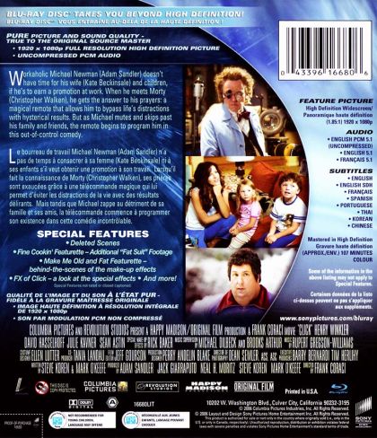 A harried workaholic, Michael Newman (Adam Sandler) doesn't have time for his wife (Kate Beckinsale) and children, not if he's to impress his ungrateful boss and earn a well-deserved promotion. So when he meets Morty (Christopher Walken), a loopy sales clerk, he gets the answer to his prayers: a magical remote that allows him to bypass life's little distractions with increasingly hysterical results. But as Michael gleefully mutes, skips and scans past his family and his friends, the remote gradually takes over his life and begins to program him, in this fast, funny and out-of-control comedy adventure.