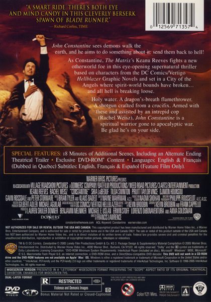 John Constantine sees demons walk the earth, and he aims to do something about it: send them back to hell!As Constantine, The Matrix's Keanu Reeves fights a new otherworld foe in this eye-popping supernatural thriller based on characters from the DC Comics/Vertigo Hellblazer Graphic Novels and set in a City of the Angels where spirit-world bounds have broken...and all hell is breaking loose.Holy water. A dragon's-breath flamethrower. A shotgun crafted from a crucifix. Armed with these and assisted by an intrepid cop (Rachel Weisz), John Constantine is a spiritual warrior gone to apocalyptic war. Be glad he's on your side.