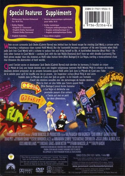 When ex-con cartoonist Jack Deebs (Gabriel Byrne) was behind bars he found escape by creating Cool World, a cartoon series featuring a voluptuous vixen named Holli Would. But the 'toonsmith becomes a prisoner of his own fantasies when Holli pulls Jack into Cool World with a scheme to seduce him and bring herself to life. A hard-boiled detective (Brad Pitt) - the only other human in Cool World - cautions Jack with the law: Noids (humans) don't have sex with doodles (cartoons). The flesh proves weaker than ink, however, as Holli takes human form (Kim Basinger) in Las Vegas, starting a trans-universal chase that threatens the destruction of both worlds.