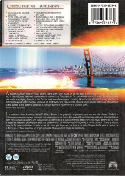 Academy award winner Hilary Swank (Boy's Don't Cry) leads an all-star cast in this electrifying journey that puts you in the middle of the most spectacluar film adventure. Geophysicist Dr. Josh Keyes (Aaron Eckhart, Erin Brokovich) has made a terrifying discovery: the Earth's inner core has stopped rotating. Now the planet's electromagnetic field is deteriorating and within months, Earth will be destroyed. One hope exists: to send Keyes and an elite team of scientists to the centre of the Earth to detonate a nuclear device to reactivate the planet's core.La lauréate d’un Academy Award Hillary Swank (Les Garçons ne Pleurent Pas) est en tête d’une distribution éblouissante dans ce voyage fascinant qui vous propulse au coeur de l’un des films d’aventures les plus spectaculaires. Josh Keyes (Aaron Eckhart, Erin Brokovich), géophysicien, a fait une terrible découverte : le noyau central de la Terre a cessé sa rotation, provoquant ainsi une détérioration du champ électromagnétique de la planète. Dans quelques mois, la Terre sera détruite. Il reste un espoir : envoyer Keyes et une équipe de scientifiques d’élite vers le centre de la Terre pour y faire exploser un engin nucléaire et réactiver le noyau de la planète.
