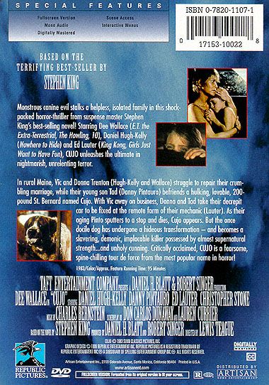 Terror Has A New Name… From The Terrifying Novel By Stephen KingMonstrous canine evil stalks a helpless, isolated family in this shock-packed horror-thriller from master Stephen King's best-selling novel! Starring Dee Wallace, Daniel Hugh-Kelly and Ed Lauter, CUJO unleashes the ultimate in nightmarish, unrelenting terror.In rural Maine, Vic and Donna Trenton struggle to repair their crumbling marriage, while their young son Tad (Danny Pintauro) befriends a hulking, lovable, 200-pound St. Bernard named Cujo. With Vic away on business, Donna and Tad take their decrepit car to be fixed at the remote farm of their mechanic (Lauter). As their aging Pinto sputters to a stop and dies, Cujo appears. But the once docile dog has undergone a hideous transformation - and becomes a slavering, demonic, implacable killer possessed by almost supernatural strength… and unholy cunning. Critically acclaimed, CUJO is a fearsome, spine-chilling tour de force from the most popular name in horror!