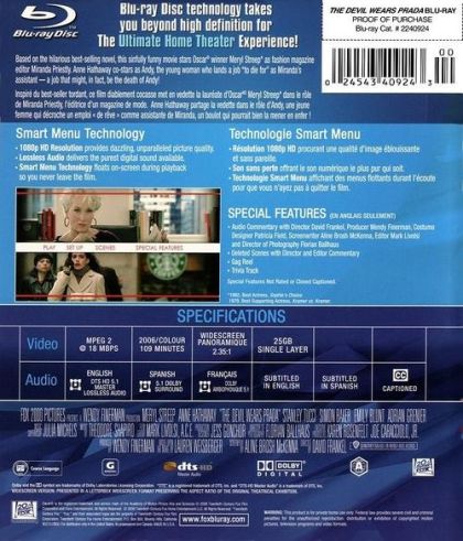 Based on the hilarious best-selling novel, this sinfully funny movie stars Oscar winner Meryl Streep as fashion magazine editor Miranda Priestly. Anne Hathaway co-stars as Andy, the young woman who finds a job "to die for" as Miranda's assistant -- a job that might, in fact, be the death of Andy!Inspiré du best-seller tordant, ce film diablement cocasse met en vedette la lauréate d'oscar Meryl Streep dans le rôle de Miranda Priestly, l'éditrice d'un magazine de mode. Anne Hathaway partage la vedette dans le rôle d'Andy, une jeune femme qui décroche un emploi "de rêve" comme assistante de Miranda, un boulot qui parrait bien la mener en enfer !