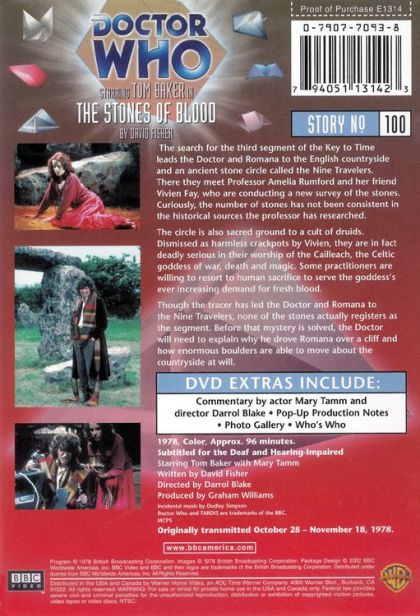 The search for the third segment of the Key to Time leads the Doctor and Romana to the English countryside and an ancient stone circle called the Nine Travelers. There they meet professor Amelia Rumford and her frient Vivien Fay, who are conducting a new survey of the stones. Curiously, the number of stones has not been consistent in the historical sources the professor has researched.The circle is also sacred ground to a cult of druids. Dismissed as harmless crackpots by Vivien, they are in fact deadly serious in their worship of Cailleach, the Celtic goddess of war, death and magic. Some practitioners are willing to resort to human sacrifice to serve the goddess's ever increasing demand for fresh blood.Though the tracer has led the Doctor and Romana to the Nine Travelers, none of the stones actually registers as the segment. Before that mystery is solved,the Doctor will need to explain why he drove Romana over a cliff and how enormous boulders are able to move about the countryside at will.