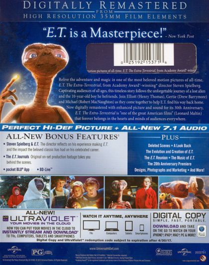 Relive the adventure and magic in one of the most beloved motion pictures of all-time, E.T. The Extra-Terrestrial, from Academy Award-winning director Steven Spielberg. Captivating audiences of all ages, this timeless story follows the unforgettable journey of a lost alien and the 10-year-old boy he befriends. Join Elliot (Henry Thomas), Gertie (Drew Barrymore) and Michael (Robert MacNaughton) as they come together to help E.T. find his way back home. Now digitally remastered with enhanced picture and sound for its 30th Anniversary, E.T. The Extra-Terrestrial is "one of the great American films" (Leonard Maltin) that forever belongs in the hearts and minds of audiences everywhere.