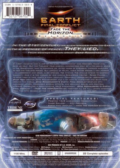 At first, mankind was in awe of its alien "companions" who promised peace and gave us help. But the Taelons' true mission, understood only by a few brave souls in the Resistance, was to dominate us. After years of struggle, mankind survives to see the Taelons perish. But instead of relief, their demise brings a new horror - an aggressive and cruel alien species, the Atavus. The Atavus intend to destroy humanity. And it is the mission of one daring Resistance fighter - Renee Palmer - to stop them in this, Earth's final conflict. Originally conceived by legendary Star Trek creator Gene Rodenberry and a hit with TV audiences and sci-fi fans around the world, Gene Roddenberry's Earth: Final Conflict bristles with explosive action, incredible special effects, and brilliant social and political intrigue. Presented in breathtaking 16x9 widescreen, Gene Roddenberry's Earth: Final Conflict - Face the Horizon brings together all 22 full-length episodes from the fifth season of the hit TV series into one powerhouse box set!