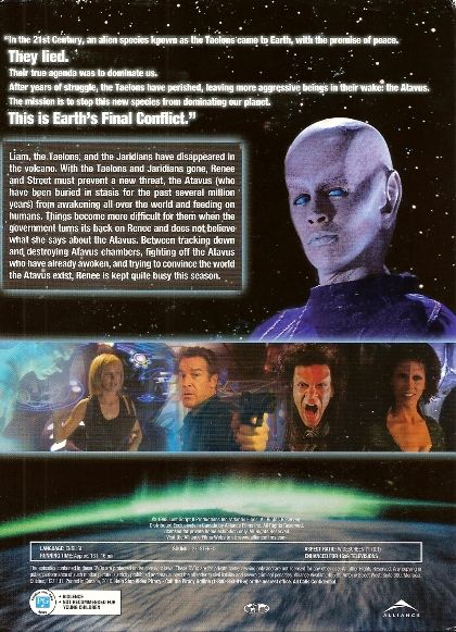 "In the 21st Century, an alien species known as the Taelons came to Earth, with the promise of peace,They Lied.Their true agenda was to dominate us.After years of struggle, the Taelons have perished, leaving more aggressive beings in their wake: The Atavus.the mission is to stop this new species from dominating our planet.This Is Earth's Final Conflict."Liam, The Taelons, and the Jaridians have disappeared in the volcano. With the Taelons and Jaridians gone, Renee and Street must prevent a new threat, the Atavus (who have been buried in stasis for the past several million years) from awakening all over the world and feeding on humans. Things become more difficult for them when the government turns its back on Renee and does not believe what she says about the Atavus. Between tracking down and destroying Atavus chambers, fighting off the Atavus who have already awoken, and trying to convince the world the Atavus exist, Renee is kept quite busy this season.