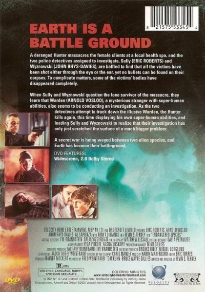A deranged Hunter massacres the female clients at a local health spa, and the two police detectives assigned to investigate, Sully (ERIC ROBERTS) and Wyznowski (JOHN RHYS-DAVIES), are baffled to find that all the victims have been shot either through the eye or the ear, yet no bullets can be found on their corpses. To complicate maters, some of the victims' bodies have disappeared completely.When Sully and Wyznowski question the lone survivor of the massacre, they learn that Warden (ARNOLD VOSLOO), a mysterious stranger with super-human abilities, also seems to be conducting an investigation. As the two detectives attempt to track down the illusive Warden, the Hunter kills again, this time displaying his own super-human abilities, and leading Sully and Wyznowski to realize that their investigation has only just scratched the surface of a much bigger problem: A secret war is being waged between two alien species, and Earth has become their battleground.