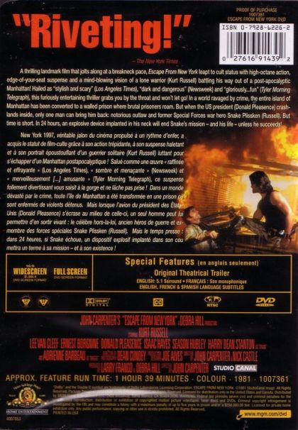 A thrilling landmark film that jolts along at a breakneck pace, Escape From New York leapt to cult status with high-octane action, edge-of-your-seat suspense and a mind-blowing vision of a lone warrior (Kurt Russel) battling his way out of a post-apocalyptic Manhattan! Hailed as "Stylish and scary" (Los Angeles Times), "dark and dangerous" (Newsweek) and "gloriously ...fun" (Tyler Morning Telegraph), this furiously entertaining thriller grabs you by the throat and won't let go! In a world ravaged by crime, the entire island of Manhattan has been converted to a walled prison where brutal prisoners roam. But when the US president (Donald Pleasence) crash-lands inside, only one man can bring him back: notorious outlaw and former Special Forces war hero Snake Plissken (Russel). But time is short. In 24 hours, an explosive device implanted in his neck will end Snake's mission - and his life - unless he succeeds !