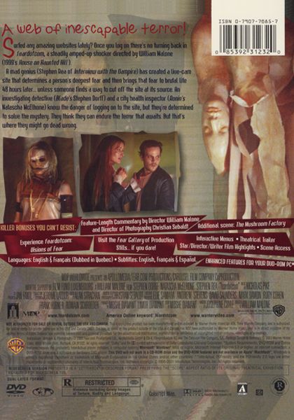 Surfed any amazing websites lately? Once you log on there’s no turning back in feardotcom, a steadily amped-up shocker directed by William Malone (House on the Haunted Hill).A mad genius (Stephen Rea, Interview with a Vampire) has created a live-cam site that determines a person’s deepest fear and then brings that fear to brutal life 48 hours later… unless someone finds a way to cut off the site at its source. An investigating detective (Blade’s Stephen Dorff) and a city health inspector (Ronin’s Natascha McElhone) know the danger of logging on to the site, but they’re determined to solve the mystery. They think they can endure the terror that awaits. But that’s where they might go dead wrong.