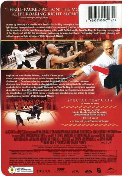 Inspired by the story of a real-life hero, 'Fearless' is a thrilling masterpiece from action superstar Jet Li. When an ill-advised fight destroys the reputation of a renowned martial arts champion (Li) and his family, his difficult path to redemption will bring him face-to-face with the most ferocious fighters in the world. Orchestrated by Yuen Wo Ping, the legendary chreographer of 'The Matrix' and 'Kill Bill', this sensational, riveting epic is being described as "astounding" and visually stunning with brilliantly executed fight sequences" (Pete Hammond, 'Maxim').Inspiré d’une vraie histoire de héros, Le Maître d’armes est un chef-d’œuvre palpitant mettant en vedette la superstar du cinéma d’action Jet Li. Quand une mêlée tourne mal et détruit la réputation d’un célèbre champion d’arts martiaux (Li) et de sa famille, le chemin tumultueux vers la rédemption lui fera affronter les combattants les plus féroces du monde. Orchestré par Yuen Wo Ping, le chorégraphe légendaire de La Matrice et Tuer Bill, ce film sensationnel et spectaculaire mérite pleinement le qualificatif d’ « époustouflant » et d’être décrit comme « visuellement splendide avec des scènes de combat magnifiquement menées » (Pete Hammond, Maxim).