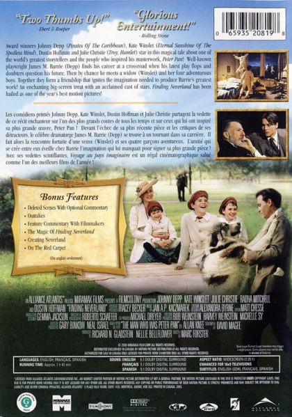 Award winners Johnny Depp (Pirates of the Caribbean), Kate Winslet (Eternal Sunshine Of The Spotless Mind), Dustin Hoffman and Julie Christie (Troy, Hamlet) star in this magical tale about one of the world's greatest storytellers and the people who inspired his masterwork, Peter Pan! Well-known playwright James M. Barrie (Depp) finds his career at a crossroad when his latest play flops and doubters question his future. Then by chance he meets a widow (Winslet) and her four adventurous boys. Together they form a friendship that ignites the imagination needed to produce Barrie's greatest work! An enchanting big-screen treat with an acclaimed cast of stars, Finding Neverland has been hailed as one of the year's best motion pictures!