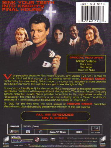 Vampire police detective Nick Knight (Geraint Wyn Davies, TV's "24") is back for the third and final season of the thrilling horror series, FOREVER KNIGHT. Tortured by his immortality, Nick's hunger to recover his humanity is more powerful than his lust for blood. But will Nick ever get to see the light of day?Tracey Vetter (Lisa Ryder) joins the cast as Nick's new partner at the police department, and Davies' real-life son Galen plays Patrick the orphan in "The Human Factor." The third season highlights include Nick's possible connection to the mysterious murder of "Blackwing," the race to discover a cure for a deadly virus in "Fever," and Nick's enlisting of a confined madman to solve a brutal slaying in "Trophy Girl."On DVD for the first time, the third season of FOREVER KNIGHT completes the series and gives diehard fans the ultimate collection of this cult favorite!