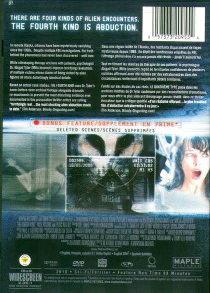 Dans une région isolée de l’Alaska, des habitants disparaissent de façon mystérieuse depuis 1960. En dépit des nombreuses enquêtes du FBI, l’étrange phénomène n’a encore jamais été résolu – jusqu’à aujourd’hui. Tout en filmant les séances de thérapie de ses patients, la psychologue Abigail Tyler reçoit de terrifiantes confidences de plusieurs victimes affirmant avoir été visitées par des extraterrestres dans des circonstances renfermant d’inquiétants détails similaires. Fondé sur des études de cas réels, Le quatrième type puise dans les archives inédites du Dr Tyler soutenues par des reconstitutions dramatiques, pour nous offrir le plus sidérant témoignage jamais révélé. --------------------------------------------------------------------------Fact-based thriller involving an ongoing unsolved mystery in Alaska, where one town has seen an extraordinary number of unexplained disappearances during the past 40 years and there are accusations of a federal cover up.