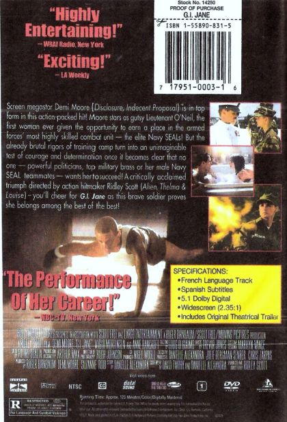 Screen megastar Demi Moore (Disclosure, Indecent Proposal) is in top form in this action-packed hit! Moore stars as gutsy Lieutenant O'Neil, the first woman ever given the opportunity to earn a place in the armed forces' most highly skilled combat unit – the elite Navy SEALs! But the already brutal rigors of training camp turn into an unimaginable test of courage and determination once it becomes clear that no one – powerful politicians, top military brass or her male Navy SEAL teammates – wants her to succeed! A critically acclaimed triumph directed by action hitmaker Ridley Scott (Alien, Thelma & Louise) - you'll cheer for G.I. Jane as this brave soldier proves she belongs among the best of the best!