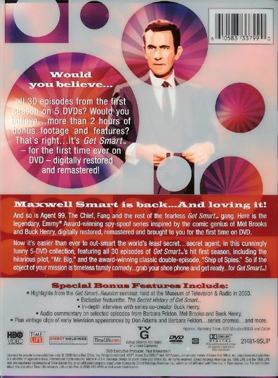 Maxwell Smart is back... and loving it. And so is Agent 99, The Chief, Fang and the rest of the fearless Get Smart gang. Her is the lengdary, Emmy Award-winning spy-spoof sries inspired by the comic genious of Mel Brooks and Buck Henry, digitally restored, remastered and brought to you for the first time on DVD.Now its; easier than ever to out-smart the world's least secret ... secret agent, in this cunningly funny 5-DVD collection, featuring all 30 episodes of Get Smart's hit first season, including the hilarious pilot "Mr Big", and the award-winning classic "Ship of Spies". So if the object of your mission is timeless family comedy... grab your shoe phone and get ready... for Get Smart...!