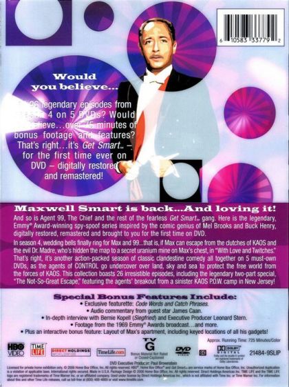 Maxwell Srnart is back...And loving it! And so is Agent 99, The Chief and the rest of the fearless Get Smarts gang. Here is the legendary, Emmy Award-winning spy-spoof series inspired by the comic genius of Mel Brooks and Buck Henry, digitally restored, remastered and brought to you for the first time on DVD.In season 4, wedding bells finally ring for Max and 99...that is, if Max can escape from the clutches of KAOS and the evil Dr. Madre, who’s hidden the map to a secret uranium mine on Max’s chest, in "With Love and Twitches’ That’s right, it’s another action-packed season of classic clandestine comedy all together on 5 must-own DVDs, as the agents of CONTROL go undercover over land, sky and sea to protect the free world from the forces of KAOS. This collection boasts 26 irresistible episodes, including the legendary tvvo-part special, "The Not—So—Great Escape? featuring the agents’ breakout from a sinister KAOS ROW camp in New Jersey!