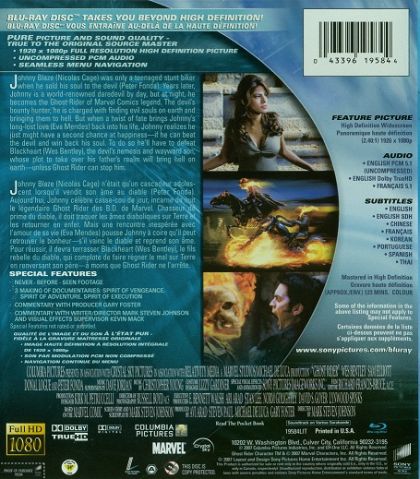 Johnny Blaze (Nicolas Cage) was only a teenaged stunt biker when he sold his soul to the devil (Peter Fonda)---a misguided attempt to save his father's life that destroyed his own. Years later, Johnny is a world renowned daredevil by day, but at night he becomes the Ghost Rider of Marvel Comics legend. The devil's bounty hunter, he is charged with finding evil souls on earth and bringing them to hell. But when a twist of fate brings Johnny's long-lost love (Eva Mendes) back into his life, Johnny realizes he just might have a second chance at happiness---if he can beat the devil and win back his soul. To do so he'll have to defeat Blackheart (Wes Bentley), the devil's nemesis and wayward son, whose plot to take over his father's realm will bring hell on earth--unless Ghost Rider can stop him.