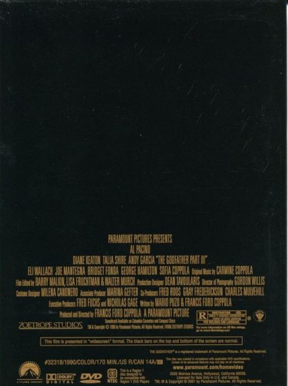 One of the greatest sagas in movie history continues. In this third film in the epic Corleone trilogy, Al Pacino reprises the role of powerful family leader Michael Corleone. Now in his 60's, Michael is dominated by two passions: freeing his family from crime and finding a suitable successor. That successor could be fiery Vincent (Andy Garcia)...but he may also be the spark that turns Michael's hope of business legitimacy into an inferno of mob violence.Francis Ford Coppola directs , Garcia, Diane Keaton, Talia Shire, Eli Wallach, Sofia Coppola, Joe Mantegna and others in this exciting, long-awaited film that masterfully explores the themes of power, tradition, revenge and love. Seven Academy Award® nominations for 1990 were the result, including Best Picture.