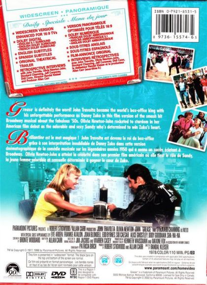 Grease is definitely the word! John Travolta became the world’s box-office king with his unforgettable performance as Danny Zuko in this film version of the smash hit Broadway musical about the fabulous ‘50s. Olivia Newton-John rocketed to stardom in her American film debut as the adorable and sexy Sandy who’s determined to win Zuko’s heart.Brillantine est le mot magique ! John Travolta est devenu le roi du box-office grâceà son interprétation inoubliable de Canny Zuko dans cette version cinematographique de la comédie musicale sur les légendaires années 1950 qui a connu un succès éclatant à Broadway. Olivia Newton-John a atteint la célébrité dans son premier film américain où elle tient le rôle de Sandy, la jeune femme adorable et sensuelle déterminée à gagner le coeur de Zuko.