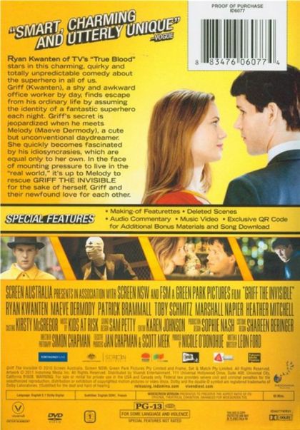 Ryan Kwanten of TV's True Blood stars in this charming, quirky and totally unpredictable romantic comedy about the superhero in all of us. Griff (Kwanten), a shy and awkward office worker by day, finds escape from his ordinary life by assuming the identity of a fantastic superhero each night. Griff's secret is jeopardized when he meets Melody (Maeve Dermody), a cute but unconventional daydreamer. She quickly becomes fascinated by his idiosyncrasies, which are equal only to her own. In the face of mounting pressure to live in the "real world," it's up to Melody to rescue Griff the Invisible for the sake of herself, Griff and their newfound love for each other.